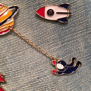 Brand new pins! Comes with 3 pins. One has a little astronaut that dangles freely on a chain. Price is for all 3 pins as a set.