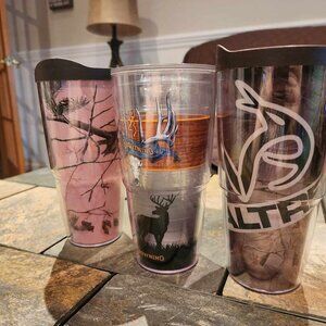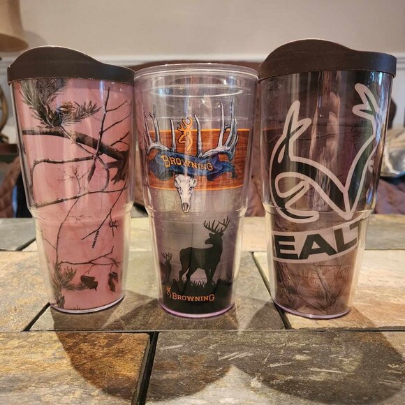 Tervis brand. Set of 3 tumblers - they are all the larger size 24 oz. Tervis cups. One is pink Realtree (shows more marks on it), a Browning Deer ones, and a Realtree camo one. Two have brown lids. They can be interchanged. They are in used, good condition. No cracks. Smoke free home.