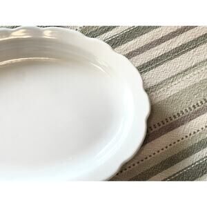 Set of 3 VTG Buffalo China 9 3/4 Oval White Scallop Edge Plates Serving Platters embossed with 1170 embossed on the back side of plate. Stamped with Code 9081. The plate/platters are in very good preowned condition with only minor signs of wear and no chips, cracks or crazing. 9 3/4” x 7.5” x 1 1/4”.