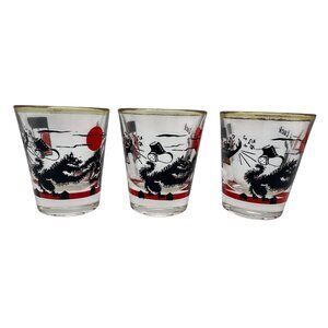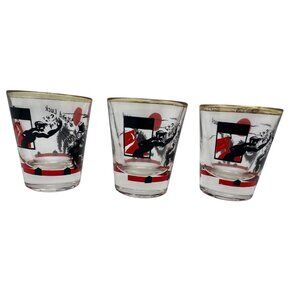 Set of three vintage 2.25" tall novelty shot glasses. Each features black cats, a rising red sun, and a humorous “Good Luck” scene with a surprised man throwing a shoe. The glasses have gold trim at the rim and bold red, black, and white graphics. Great for display or a kitschy barware addition.