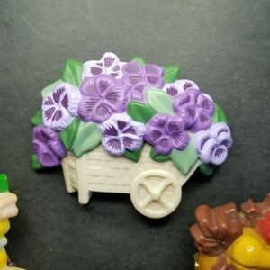 The pansies wheelbarrow cart is from the 80's. It is not dated but these were released in 1981. The wheelbarrow brooch is loaded with pretty purple pansies. Pansies stand for thoughts.