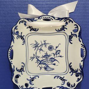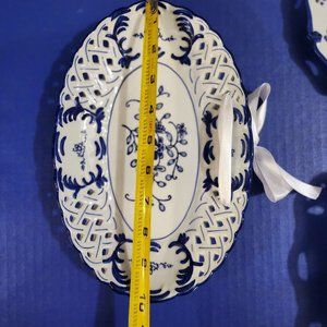 Very pretty vintage set of three, one round, one square and one oval blue and white floral reticulated plates. These were an exclusive Lillian Vernon catalog Saks item. These pretty dishes have new satin ribbon in them, making them ready to hang and display. Measurements: Square 17.5 inches Oval 9 .75 inches Round 18 inches. They're in very nice condition with no chips, nicks or scratches. Non smoking, pet free home. @ ER NW Box