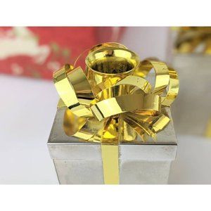 Eye-catching set of three vintage taper candle holders in the shape of silver plated gift boxes with gold tone ribbon and bows. Stunning combination and a beautiful combination for a centerpiece at your holiday gathering or on a side gift table at a wedding. The largest box is a 3.25 inch square, the medium box is 2.75 inches, and the smallest box is 2.25 inch square. Each box has an additional 1.25 inch added to the top to include the taper fitting hidden inside the gold bow on top of the box. All three boxes have an elegant, light patina normal for their age and would be a wonderful gift for the holiday or at a bridal wedding party. Family heirloom. Gift worthy.