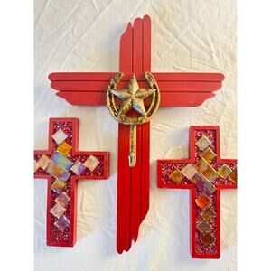 Bundle includes one large red cross with a bronze-tone star & horseshoe hook (great for keys/hats/necklace) and two coordinating red mosaic crosses with iridescent glass tiles and glitter resin inlay. Lightweight and ready to hang.