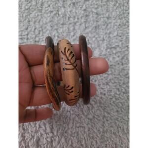 Set of 3 Wooden Bangle Bracelets Boho Tribal Carved Handcrafted Natural Brown
