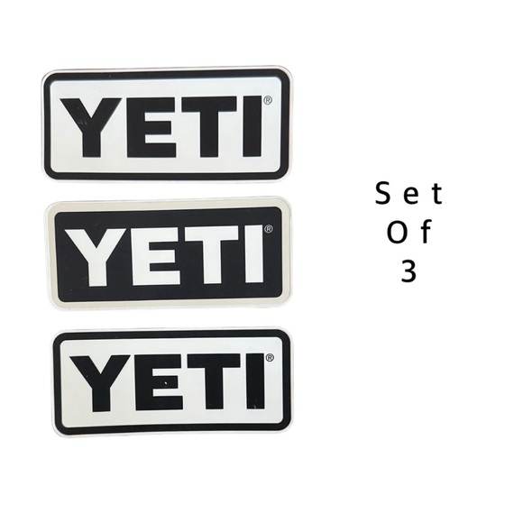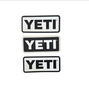 Show your love for the YETI brand with this set of 3 premium stickers. Each sticker measures approximately 2” x 3.5” and features the iconic YETI logo in a bold black and white color combo—perfect for water bottles, coolers, laptops, or toolboxes.