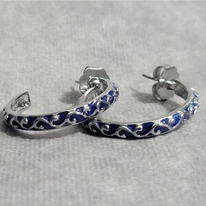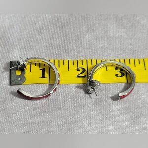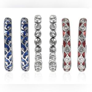 Set of 3 Austrian Crystal Criss Cross Earrings in Silvertone, Blue and Red Enameled, Hoop Earrings.