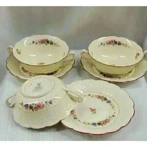 Set of 3- Cream Soup Bowls and Saucers. Cream Soup Bowl-6" (handle to handle) x 2 1/2" T. Saucers-6 1/4" Very, Very Good Vintage Condition. Some Crazing and Discoloration (due to age). No chips or cracks