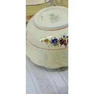 The pattern and colors on these bowls allow them to be used year round. Featuring a Floral spray and garland in the center encircled by a Red trim on a Cream background. The edges of the plate have embossed panels of alternating lattice and flowers. The rim is a gently scalloped edge trimmed in Red.