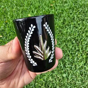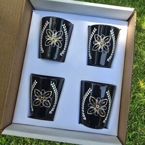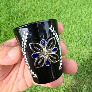 Set of 4 Black Ceramic Tequila Shot Glasses – Hand-Painted Agave Flower – Mexica