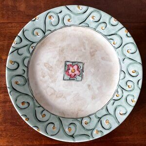 Set of four (4) pretty Corelle by Corning 8.5" luncheon plates in the discontinued "Watercolors" pattern. The design includes a reddish pink flower in the center and a scroll design on the green rim. The background of the centers has a beige "painted" look.