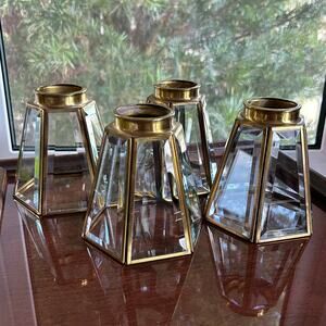 Set of 4 vintage faceted glass lamp shades with brass-tone metal frames. Each shade has six clear glass panels in a tapered shape, giving them a clean geometric look. The glass panels are thick and catch the light well, and the brass framing has natural age patina that adds to the vintage feel.