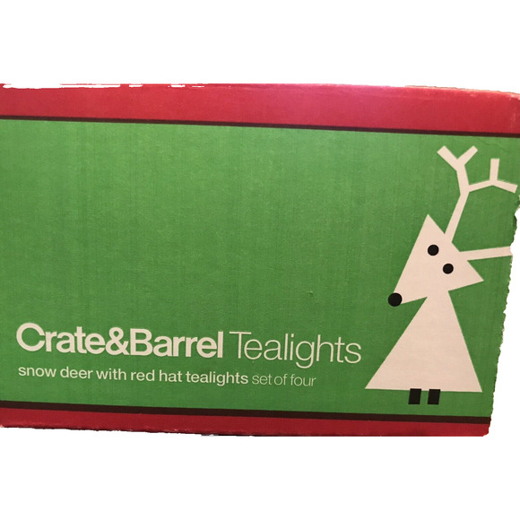 Set of 4 Frosted Glass Tea Light Holders by CRATE & BARREL Snow Deer w/Red Hats.