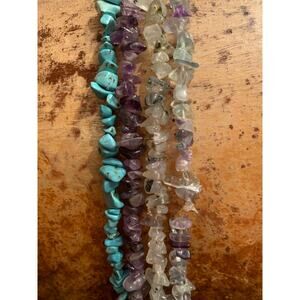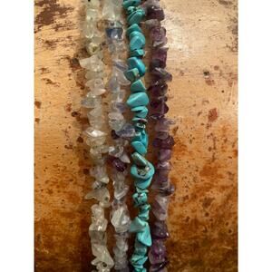 Beautiful colors for any season!! Set of 5 gemstone chip necklaces. Necklaces include turquoise, amethyst, prehnite and fluorite. Each strand measures between 34-36 inches. So many options with these beauties. No markings.