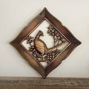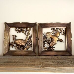 Gold framed vintage wall art set of 4 by Syrocco. Each of the four pieces has a different scene with a pheasant. These are 3D style: not painting or drawing. No chips or cracks. Some discoloration on the frame edges. These are designed to hang on the diagonal. Could possibly be hung straight with some creativity. Really nice unique pieces for a gallery wall.