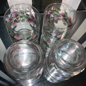 Hand painted clear drinking glasses in lavender pink / green flowers / roses