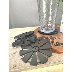 This is a set of 4, farmhouse inspired, wood windmill coasters. Each coaster has been painted black and have been sealed. Each coaster measures 4 inches in diameter.