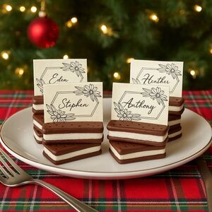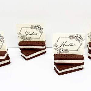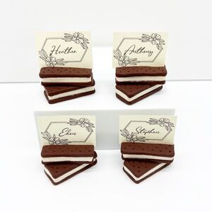 Serve up a sweet surprise with this adorable set of 4 handmade Ice Cream Sandwich Place Card Holders, sculpted from polymer clay and finished to look just like the real thing! Each piece is carefully detailed with chocolate “cookie” layers and a creamy “ice cream” center, adding the perfect whimsical touch to your holiday table, dessert party, or wedding reception.