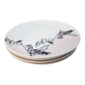 Set of 4 Ikea side, salad, dessert plates. Stunsig series. "Girl" by artist Frédérique Vernillet. White and pink with black and gray girls holding a ribbon and flying with birds. Diameter 21cm/8.25in. Limited Edition 2017. Made in Poland. Pre-owned in excellent condition.
