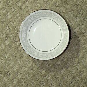 This is a gorgeous grey filagree pattern with silver trim on white porcelain by Imperial China by W. Dalton 6571 Whitney Pattern dessert / sauce bowl
