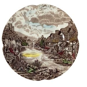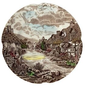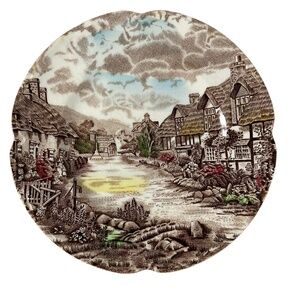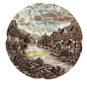 The plates feature the "Olde English Countryside" pattern by Johnson Brothers, depicting a village scene with thatched-roof houses and a winding path