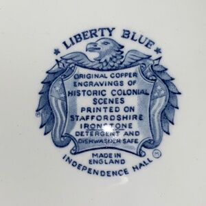 Set of 4 Liberty Blue Staffordshire dinner plates in excellent condition! No chips, crazing or cracks! Liberty Blue printed on Staffordshire Ironstone with the Independence Hall image, made in England.