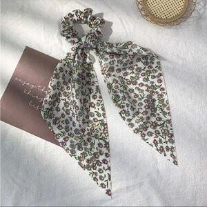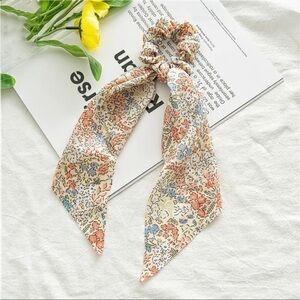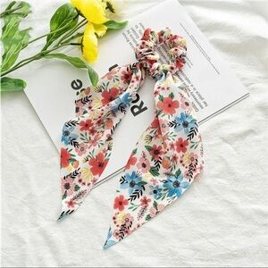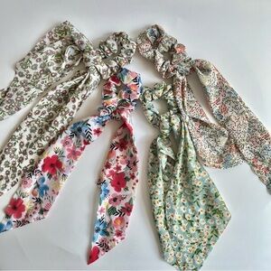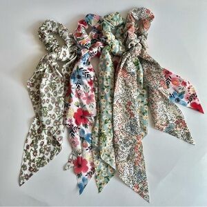Set of 4 Long Scarf Floral Colorful Scrunchies. Super cute hair accessories to elevate any outfit.