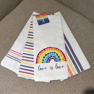 Set of 4 kitchen towels with a vibrant love is love rainbow design. Beautiful bright colors. Each towel has its own individual design. 100% cotton. Each kitchen towel measures 18in L x 28in W. Perfect addition to any home. Love Is Love. Made by Mulberry. Brand new with tags.