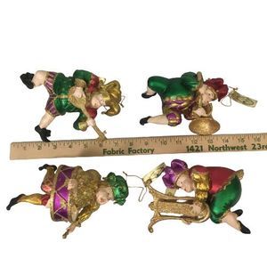 Set of 4 Mark Roberts JESTER ORNAMENTS Playing Musical Instruments Vintage w/Tags. Rare hard to find collection. Each is approximately 7" to 8" long. All four have the foil sticker still attached. They have light scratches in the paint and the harp player is missing the tip of two fingers, not noticeable when hanging on the tree. No other flaws. Please see pictures. Check out our huge selection of thrifted treasures - bundle your purchases and save on combined shipping!