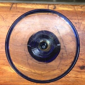 4 Mouth Blown Martini Glasses Bubble Barware with Cobalt Blue Rim & Foot. Graciously Balanced on a Translucent Stem & a Rich Blue Base. Each Glass is Individually Hand Crafted. Slight Variations in the Shape & Size of the Glass Makes Each Glass Distinct. Tiny Bubbles Within the Surface Exemplify this Rustic Technique. Versatile for Cocktails Fruit, Ice Cream, Pudding, or Other Deserts. Bottom of Smaller Glass Still Has Made in Mexico Sticker.