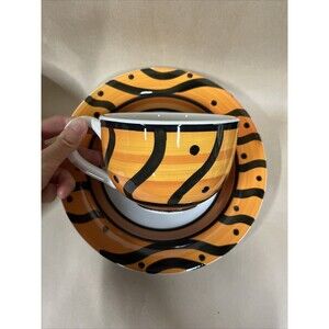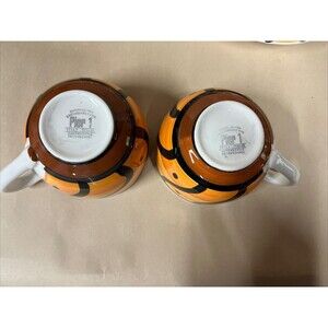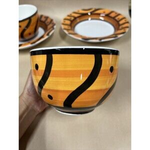 Set of 4 Pier 1 Hand Painted ITALY Orange Black Soup Bowls & Extra Big Mugs