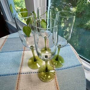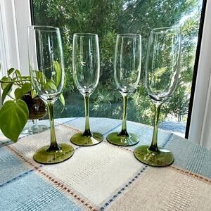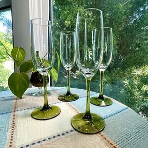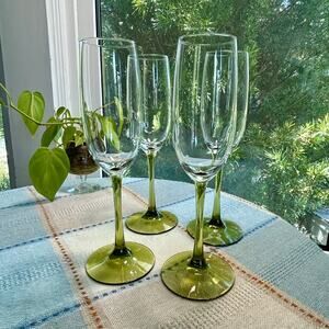 Set of four Pier 1 Pantiago champagne flutes featuring clear bowls with olive green stems and bases. These elegant glasses add a stylish pop of color to any table setting and are perfect for toasting at celebrations.