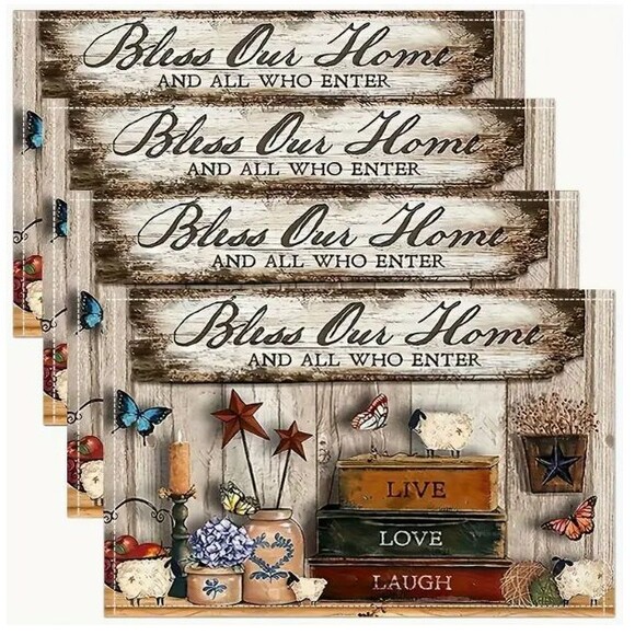 Set of 4 Placemats 12x18in Woven Polyester Thin Bless our Home