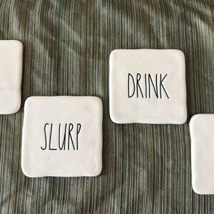 Set of 4 RAE DUNN coasters in wrought iron stand sip slurp drink gulp