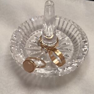 One price on 4 rings! Three rings in goldtone feature a center stone which is bezel set. These are about 7.5 size. The 4th ring is an engraved goldtone solid band which is also approx. size 7.5. I like the three bezel rings worn all together as a look!
