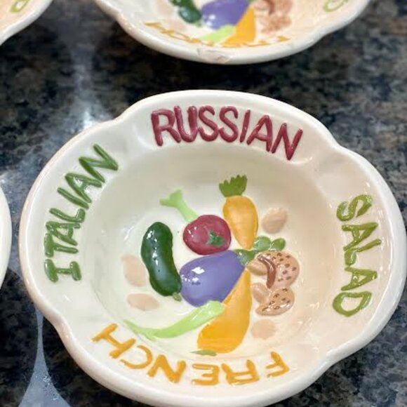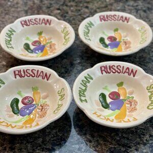 Set of 4 ceramic hand painted salad bowls with wording French, Russian, and Italian and Salad with vegetables embossed in the center with scalloped rims