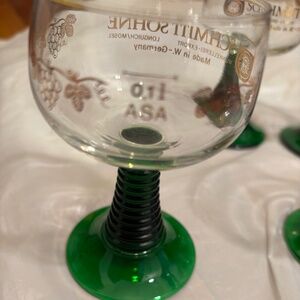 Set of four (4) Schmitt Sohne vintage green ribbed beehive stem wine glass goblet with gold inscription