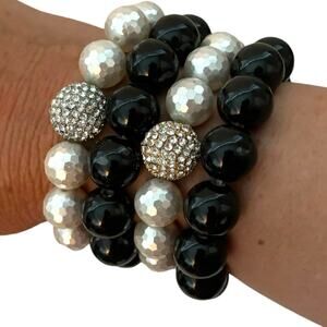 Set of 4 Stacked Bracelets. EUC. No flaws or stains. Enhance your accessory game with this versatile set of 4 stacked bracelets. The set includes two elegant white bracelets adorned with sparkling crystal accents and two sleek black bracelets. Perfect for mixing and matching, these bracelets can be worn together for a chic, layered look or separately to complement any outfit.