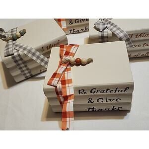 Set of 4 Stacked Faux Book Farmhouse Fall Decor Ribbon Wrapped Beads 5.75x4x3"