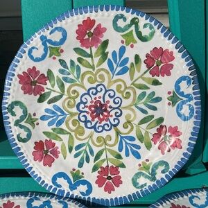 Bring a touch of island charm to your table with these colorful Tommy Bahama dinner plates. Featuring a vibrant floral and leaf design in shades of red, green, blue, and gold, this durable melamine set is perfect for both indoor and outdoor dining. Each plate is lightweight, easy to clean, and adds a cheerful, coastal vibe to any meal.