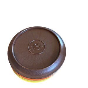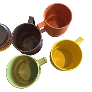 Vintage set of 4 stackable Tupperware coffee mugs with lids in a harvest color. Perfect for collectors or everyday use. Durable and convenient design for easy storage.