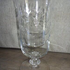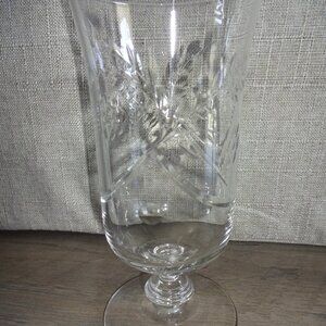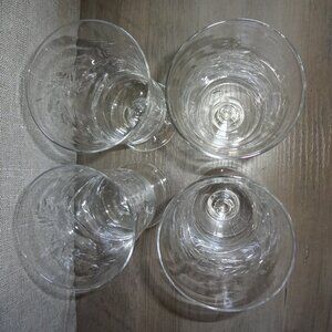 Very good pre-owned condition. Four, clear glasses with etched flowers, greenery and swirls. Holds approximately 10 ounces. Approximate measurements (widest/tallest points): 2-7/8" (base) and 2-3/4" (opening) x 6-3/8". No chips, cracks or stains.