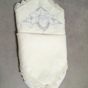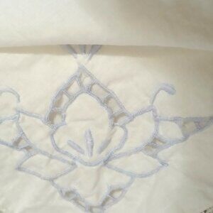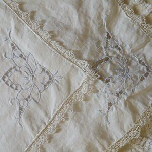 Four, white linen napkins with machine embroidered, lilac floral design. Accented with a crocheted edging. 15.5" x 15.5".