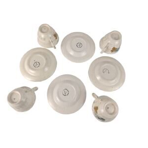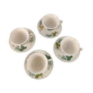 This set includes four footed tea/coffee cups measuring 2-3/4" tall by 3-7/8" diameter top edge and four saucers measuring 6-1/4" in diameter.