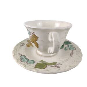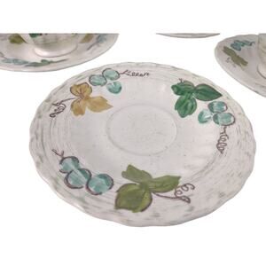 This vintage set is marked "Vernon Ware by Metlox Made in California" on the underside of each saucer. The pattern is entitled "Vineyard" and features speckled cream stoneware with handpainted blue grapes and green and gold leaves and scalloped edges. This pattern was produced from 1960 through 1980 and is no longer in production.