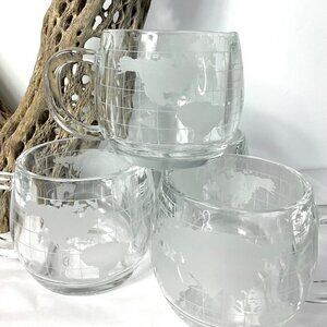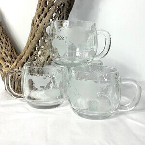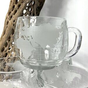 FEATURES: These heavy glass cups feature an etched old world map design / holds 8 oz / These were a promotional item from the 1970s from the Nestle Company / See photos for more details