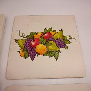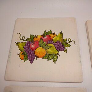 Good pre-owned condition. Square sandstone coasters with a cork backing that features fruit (grapes, apples, pears and oranges) with vines and leaves. Made in Taiwan. Approximate measurements: 4-1/8" x 4-1/8" x 1/4". Marks/stains consistent with age/use.