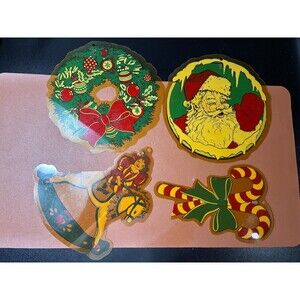 Set of 4 Vintage Santa Holiday Suncatchers, Christmas Tree Ornaments