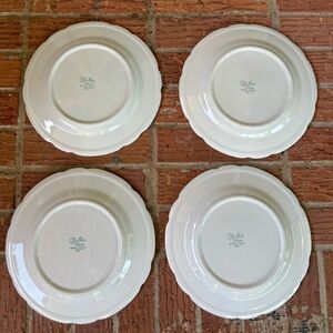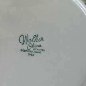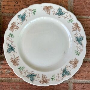 4 Vintage Walker China Bedford Ohio Vitrified 3-43 Restaurant Ware Salad Plates. Slightly Scalloped Edges with a Dip in the Center. Pattern Features Creamy Off White Background with Brown & Teal Leaves & Green Grapes Border Around the Rim.