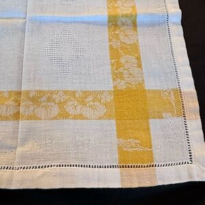 Vintage MCM Set of four white damask napkins with a yellow and white checkered border pattern. Perfect for your retro dining decor.